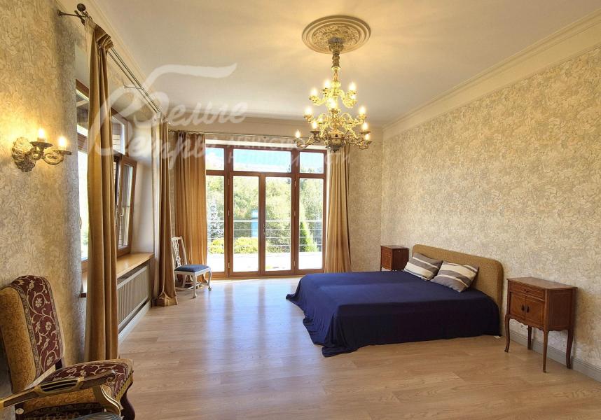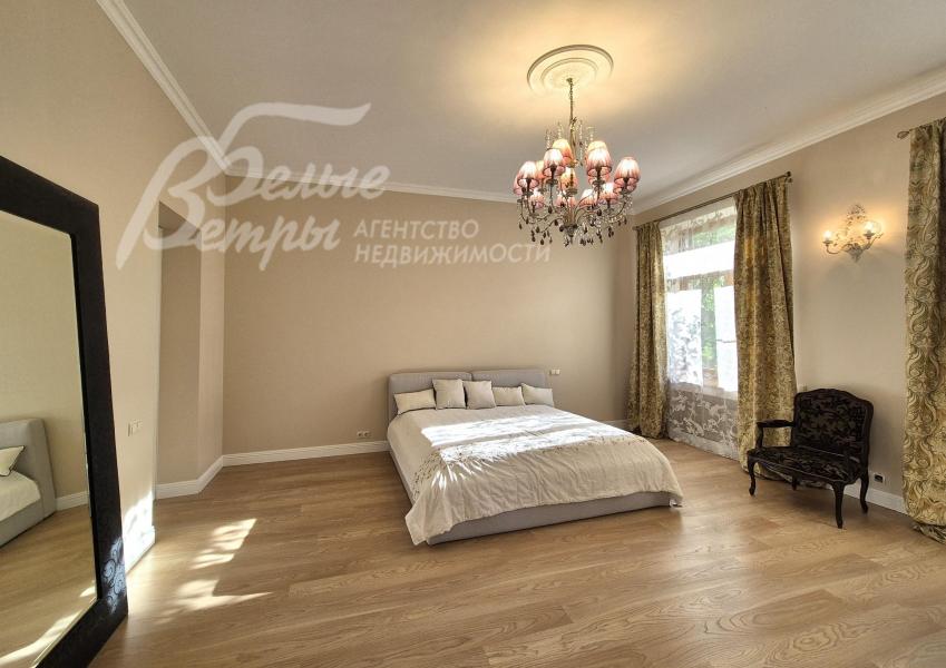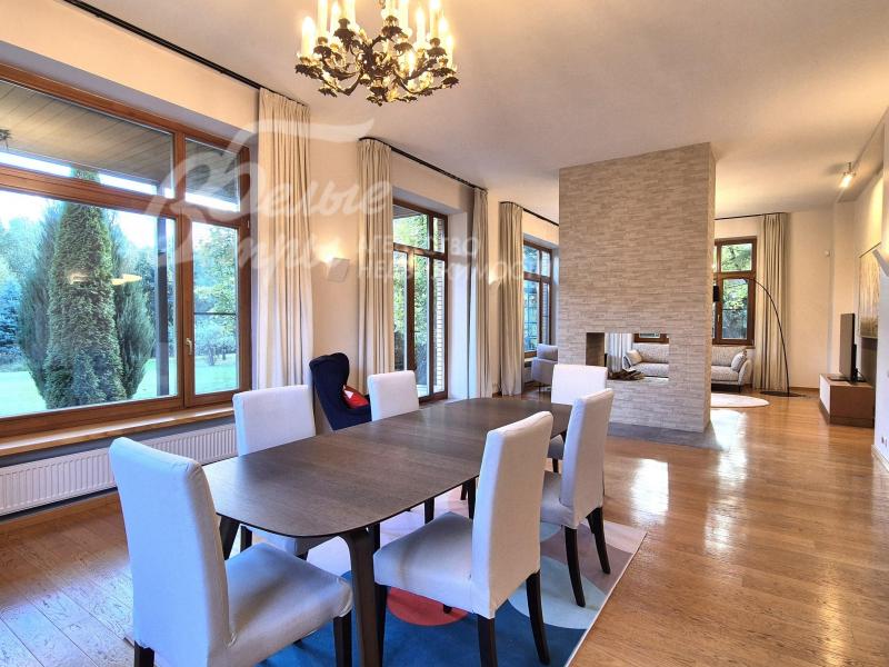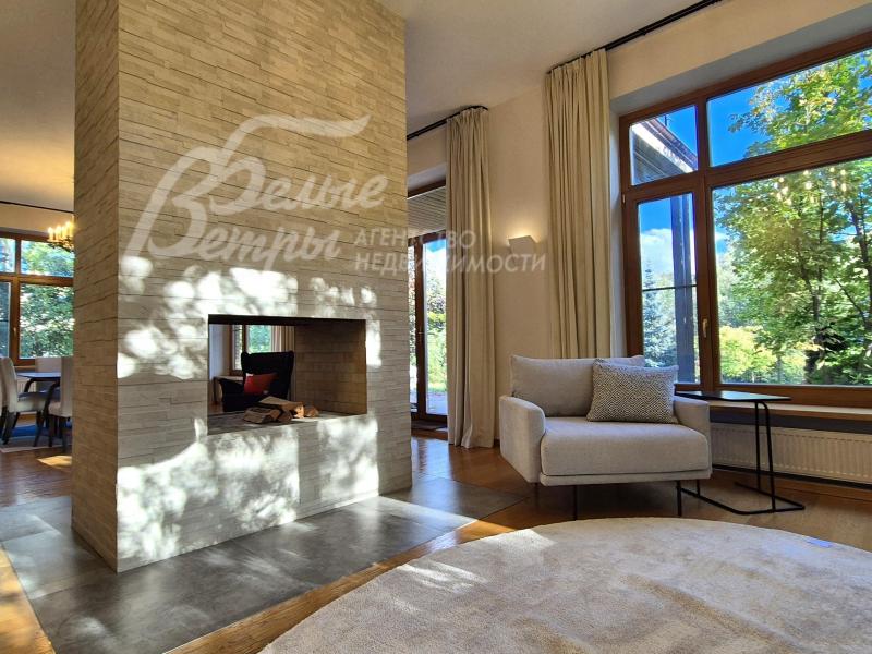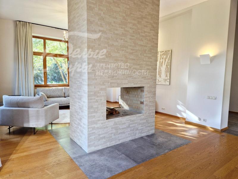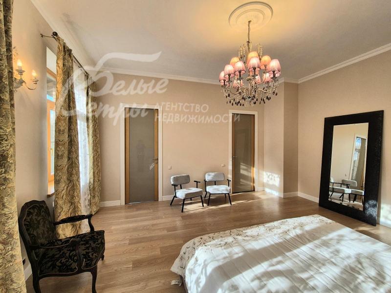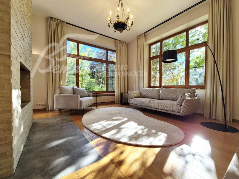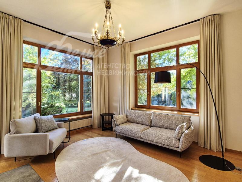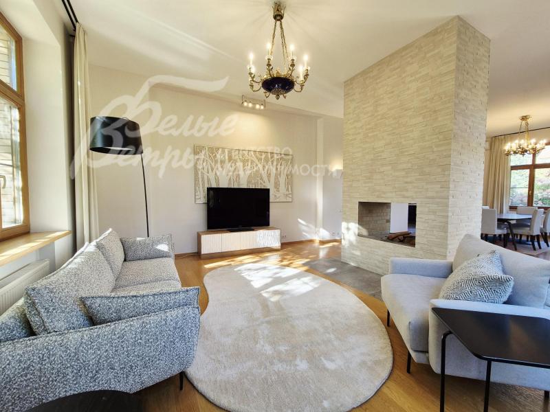 Мебель: в столовой обеденная группа на 6 персон, в гостиной новый мягкий гарнитур, в спальнях современные двуспальные кровати, тумбы, комоды, журнальные столики, гардеробные оборудованы системами хранения. Межкомнатные двери производства Италия. В прихожей настенное зеркало от немецкого бренда Rolf Benz, эксклюзивное напольное зеркало Ravel (Италия). В главной спальне люстра и бра ручной работы. В гостиной люстра от бренда "Русский модерн", светильники Flos Италия.