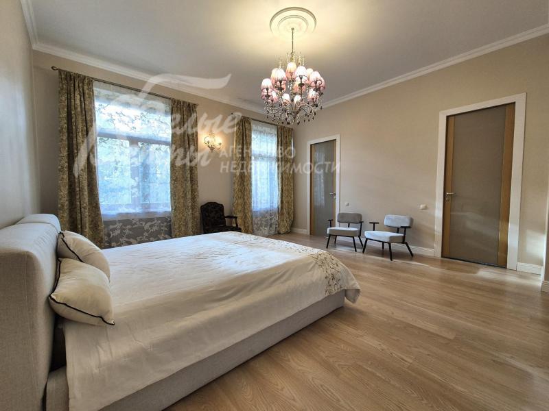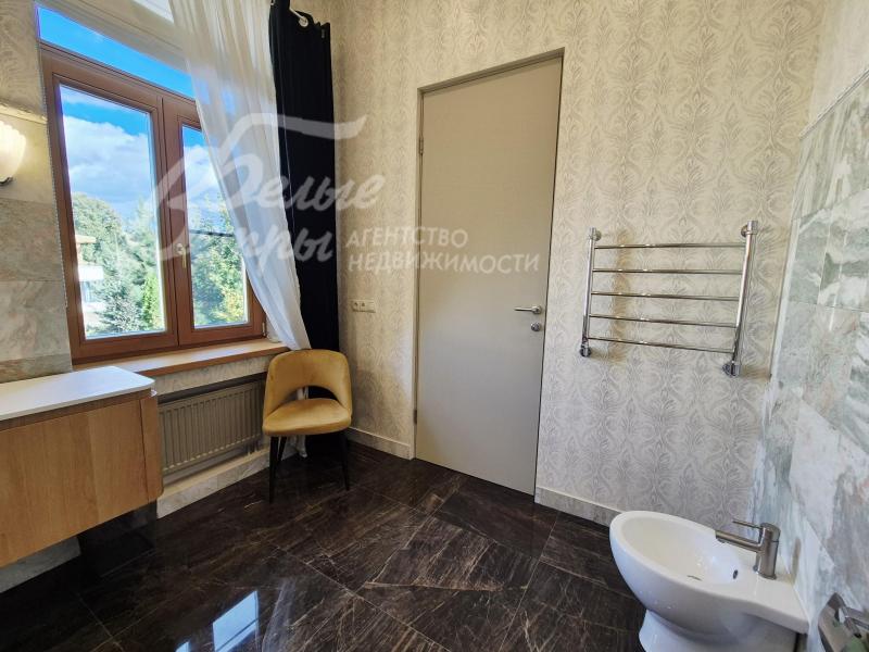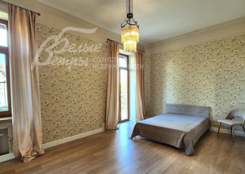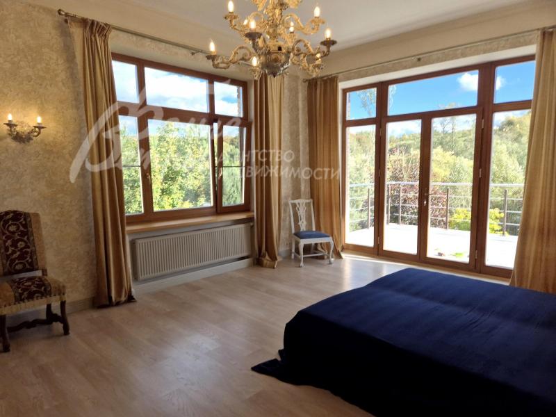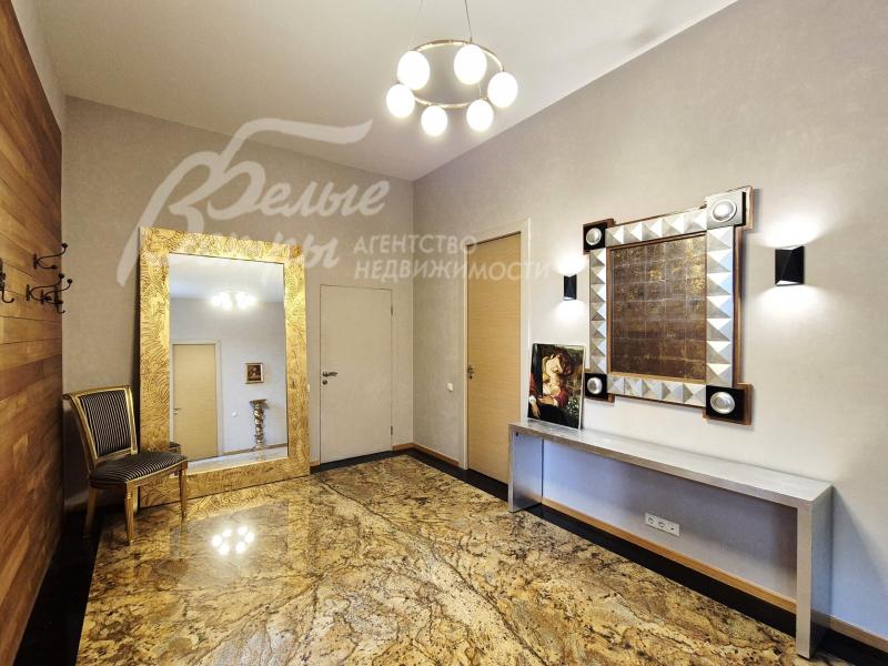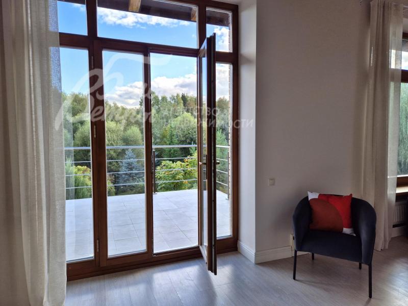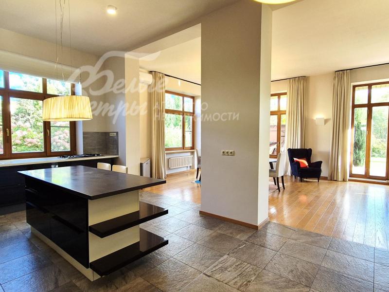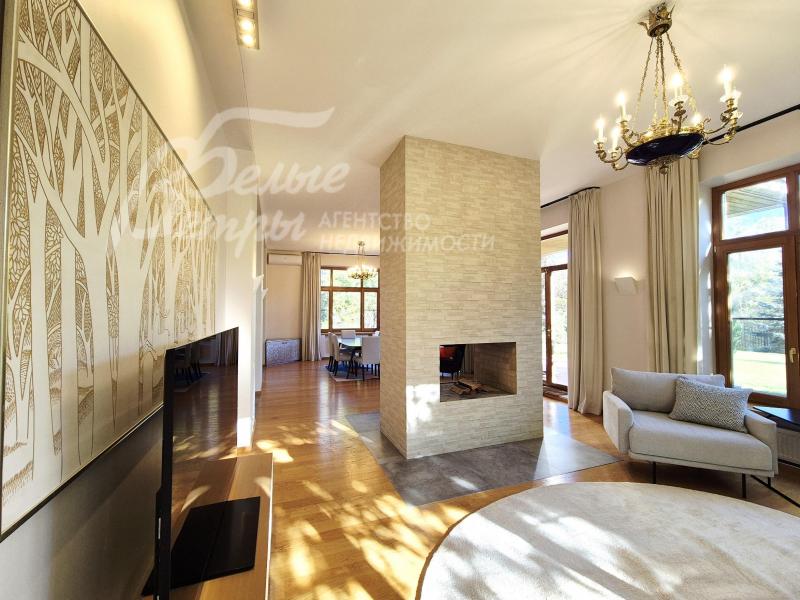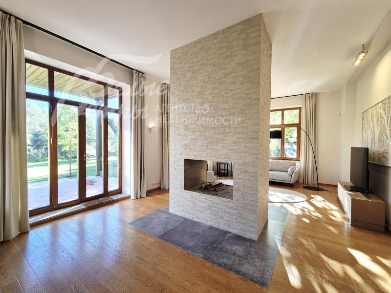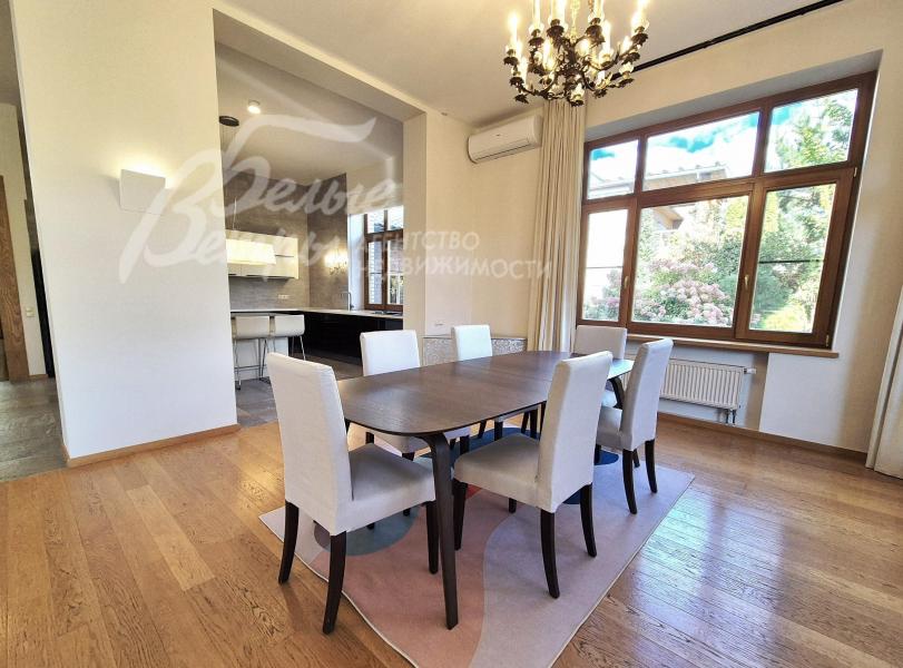 Мебель: в столовой обеденная группа на 6 персон, в гостиной новый мягкий гарнитур, в спальнях современные двуспальные кровати, тумбы, комоды, журнальные столики, гардеробные оборудованы системами хранения. Межкомнатные двери производства Италия. В прихожей настенное зеркало от немецкого бренда Rolf Benz, эксклюзивное напольное зеркало Ravel (Италия). В главной спальне люстра и бра ручной работы. В гостиной люстра от бренда "Русский модерн", светильники Flos Италия.