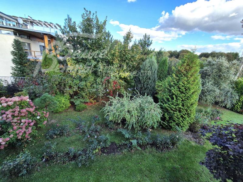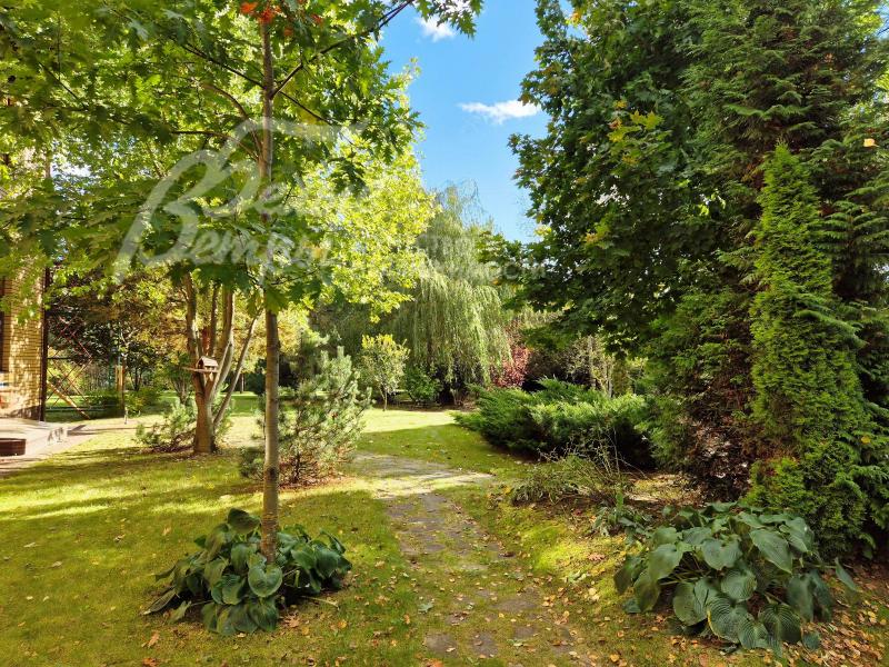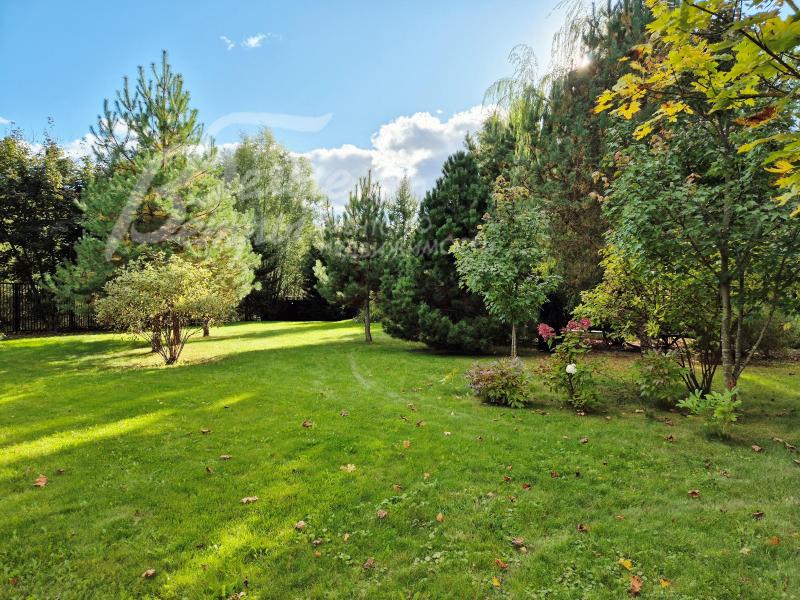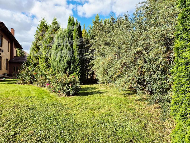 Благоустройство участка: взрослые березы, молодые ели, множество плодовых деревьев и кустарников, розарии, дорожки, газон