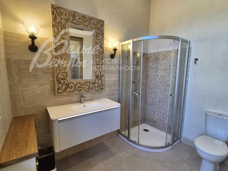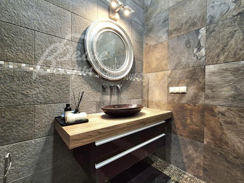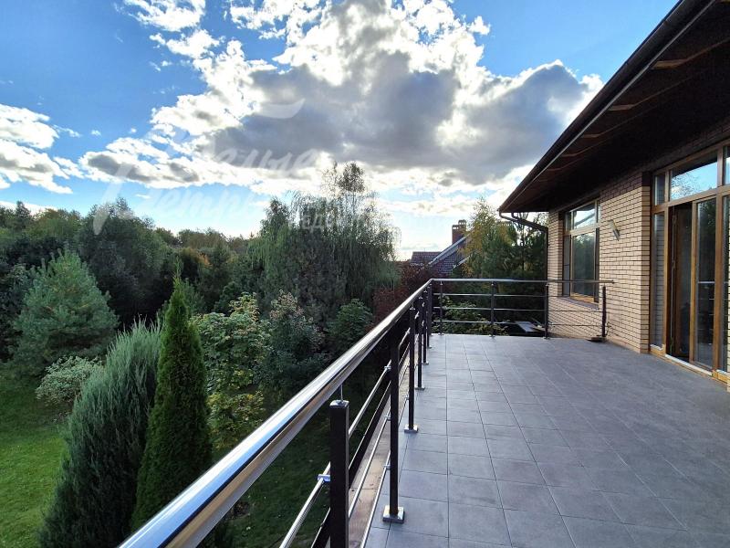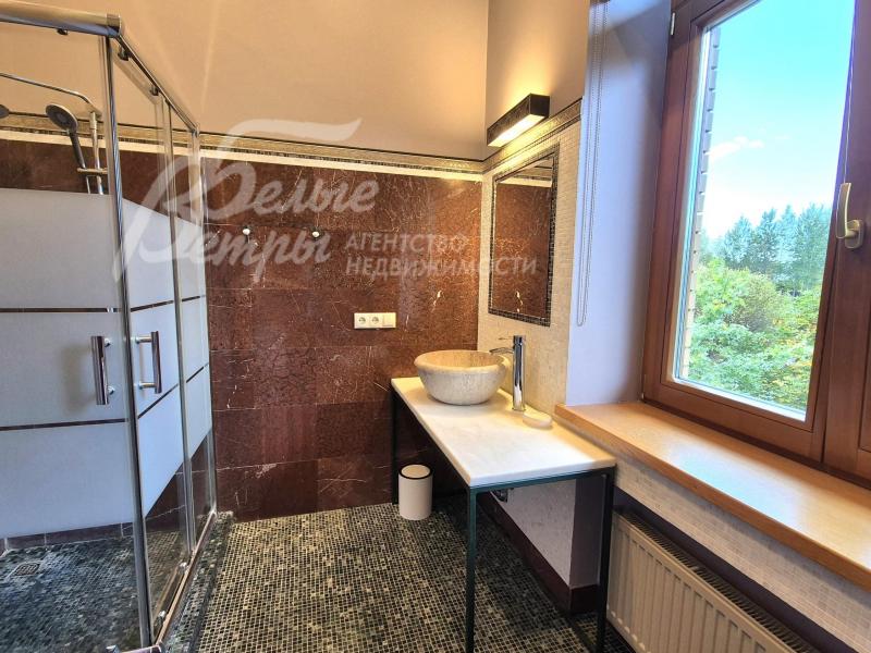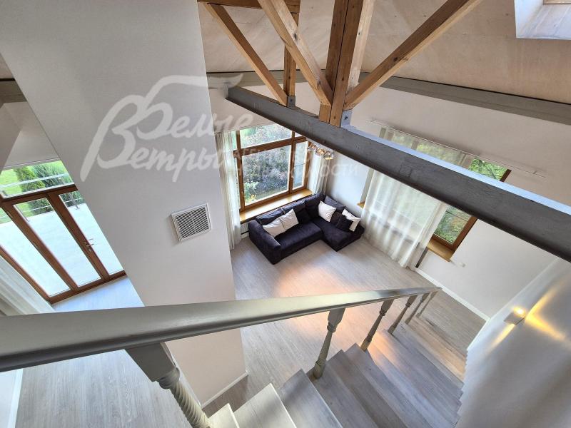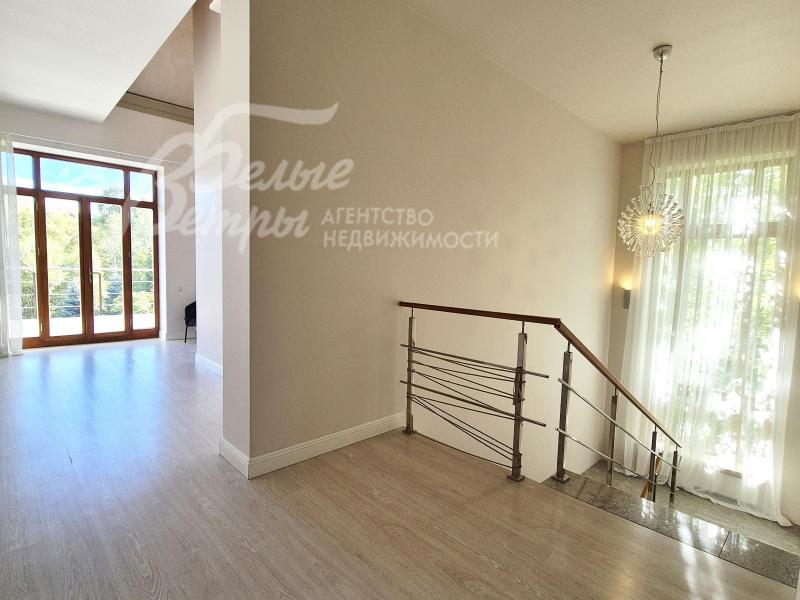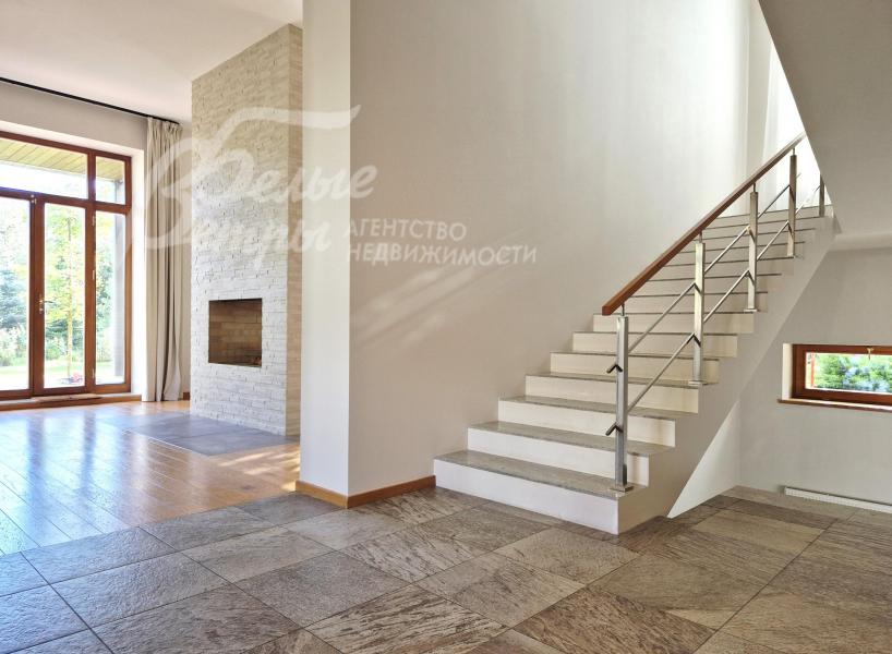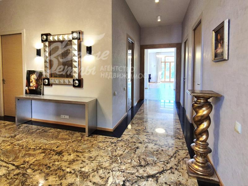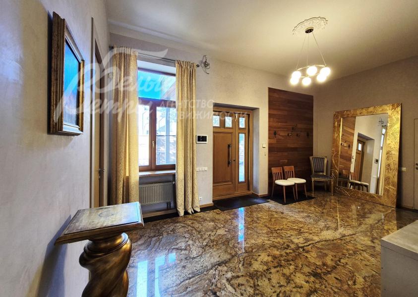 Описание внутренней отделки: Интерьер в стиле Фьюжн. Стены - декоративная штукатурка, покраска, итальянские обои, в санузлах плитка из натурального травертина и керамогранита, оникс. В прихожей панно из массива дерева Махагон. Полы - в прихожей гранитные слэбы, мрамор, натуральная дубовая доска, травертин, ламинат. Лестница - ж/б, облицована керамогранитом. Потолки на 1 и 2 этажах - 3.4 м, на 3-ем этаже - 2.5 м.