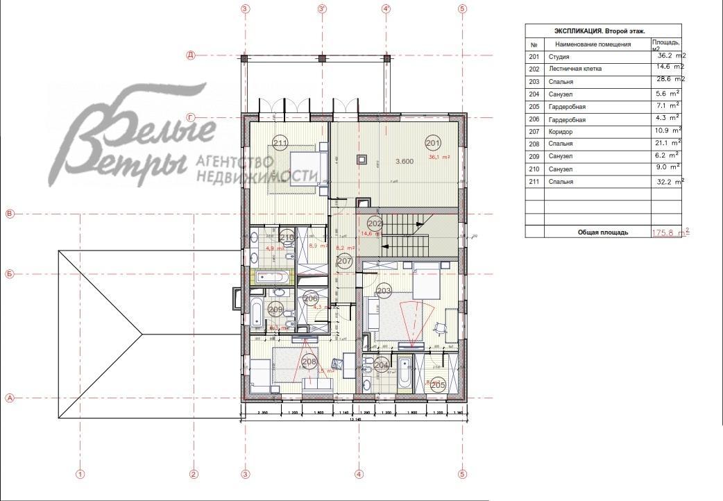 2-ой этаж: холл 11 кв.м, студия с выходом на открытую террасу 36 кв.м, мастер-спальня 32 кв.м с гардеробной 4 кв.м и санузлом (с ванной) 6 кв.м, спальня 29 кв.м с санузлом (с душевой) 6 кв.м и гардеробной 7 кв.м, детская спальня 21 кв.м с санузлом (с душевой) 6 кв.м, гардеробная 4 кв.м