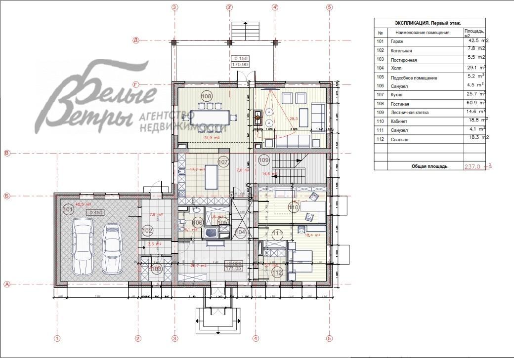 1-ый этаж: гараж 42.5 кв.м, холл 30 кв.м, санузел с душевой 6 кв.м, спальня 18 кв.м, кабинет (спальня) 19 кв.м, кухня 26 кв.м, столовая-гостиная 80 кв.м, гостевой санузел с постирочной 4 кв.м, гардеробная 6 кв.м